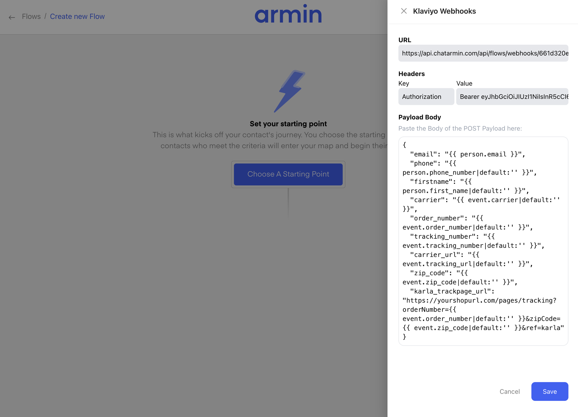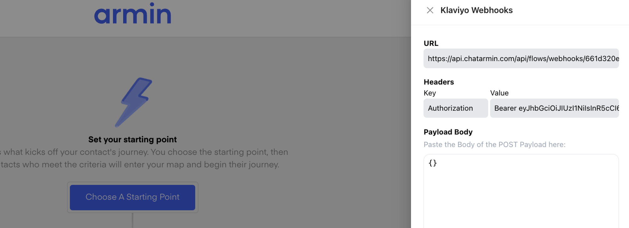 Adjust the âPayloadâ in both Klaviyoâs âJSON payload fieldâ and Chatarminâs webhook âPayload bodyâ. They have to be identical, including the following variables: