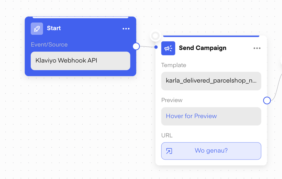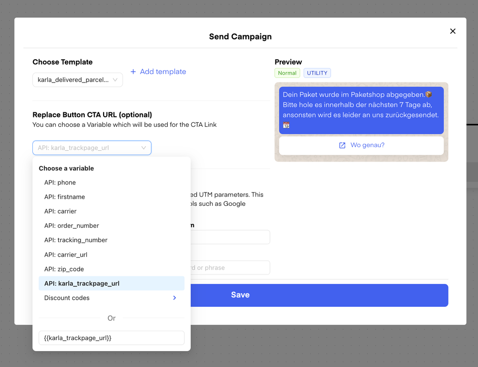 Save the flow and select âSend campaignâ as intended action. Select your campaign template in the drop-down and replace the button URL with the karla_trackpage_url
