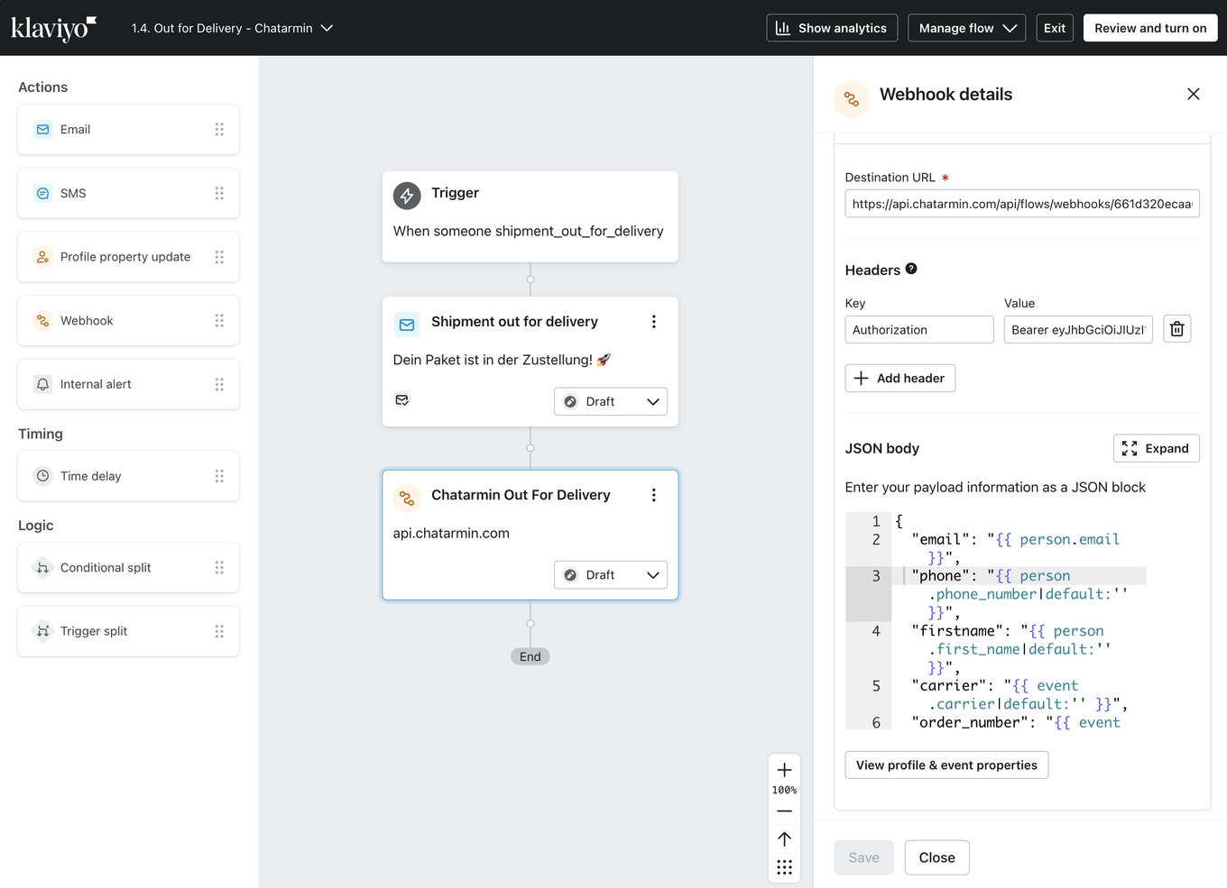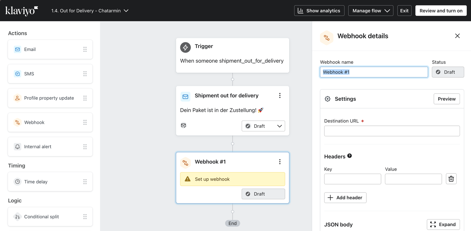 In the Klaviyo flow, add âwebhookâ as action following the respective shipment trigger and enter the Chatarmin webhook information: (Destination) URL, Key & Value from your Chatarmin flow into the Klaviyo fields and give the Webhook a name.