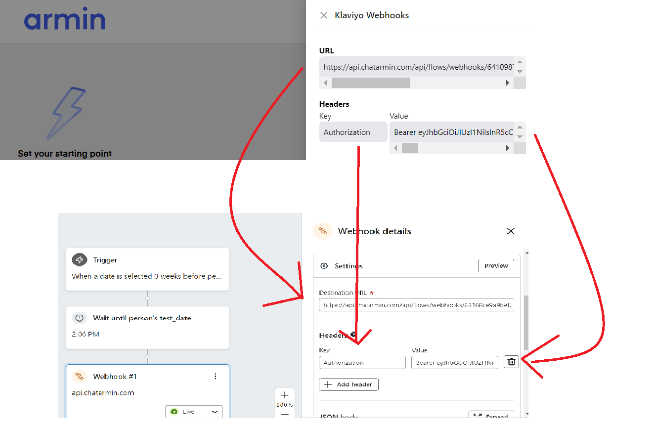 Go to chatarmin.com/flows and create a Flow with the trigger "Klaviyo Webhooks". Copy and paste the shown URL and Headers to your Klaviyo Webhook.