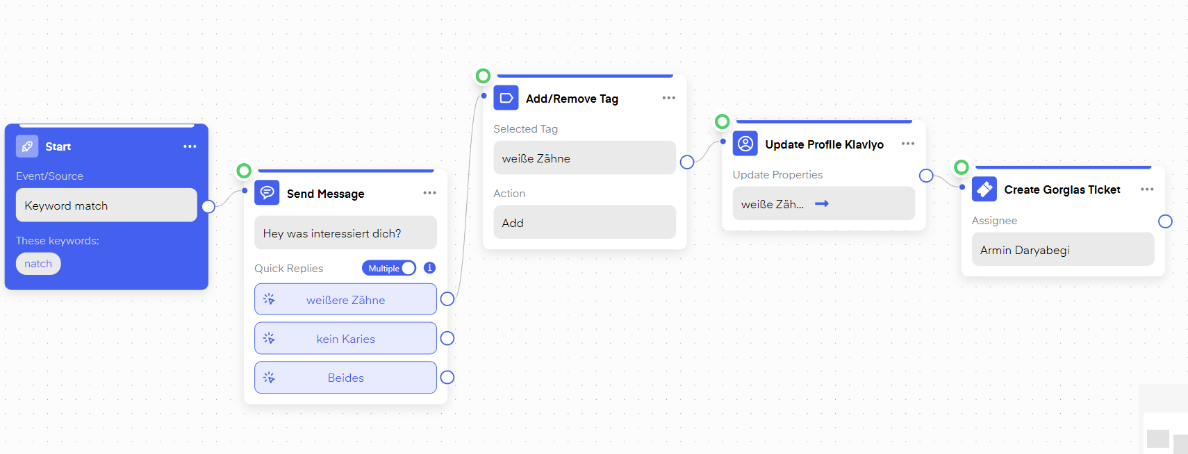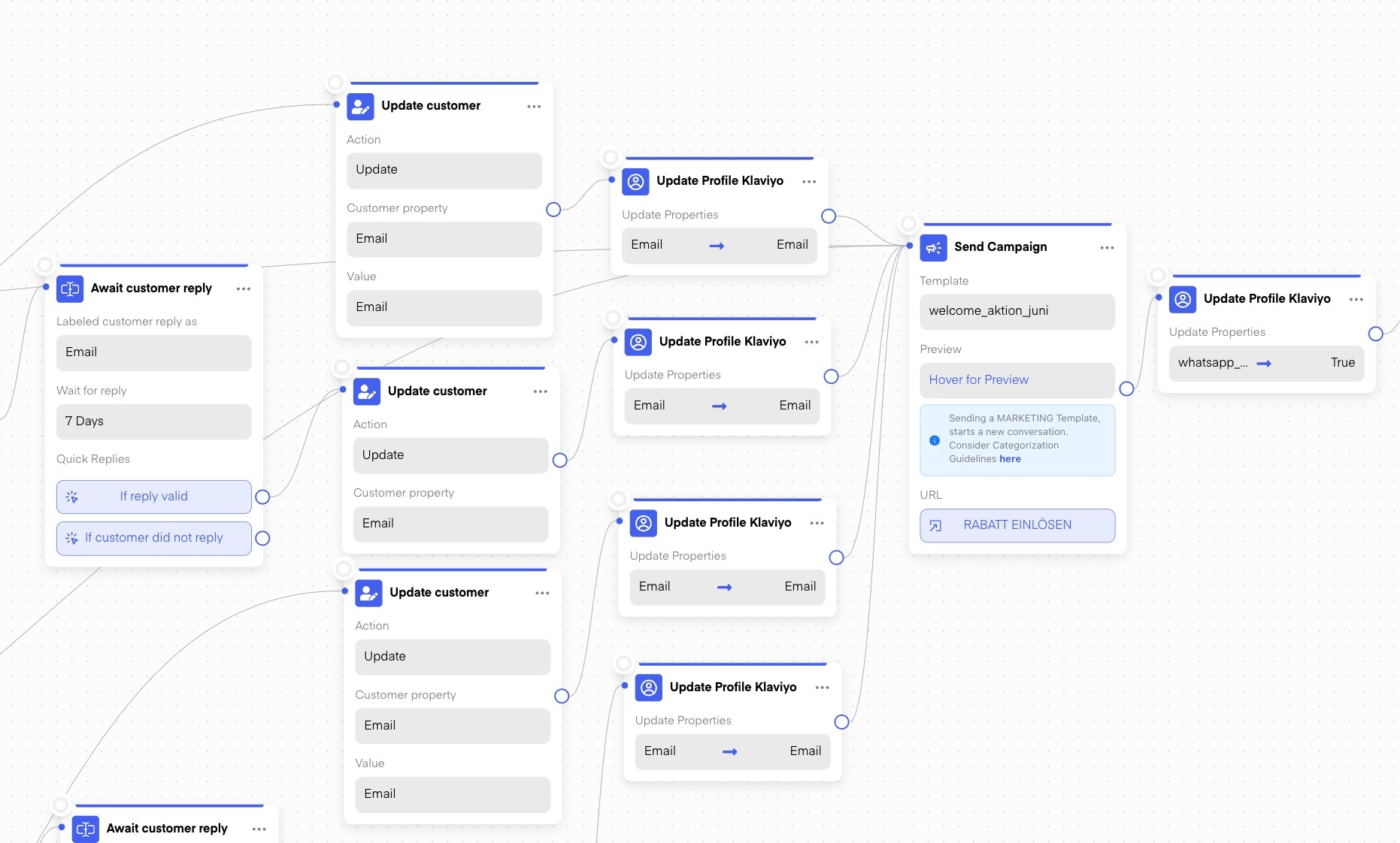 For instance, you can update Klaviyo Accounts with specific properties depending on user behavior inside of Chatarmin Flows.