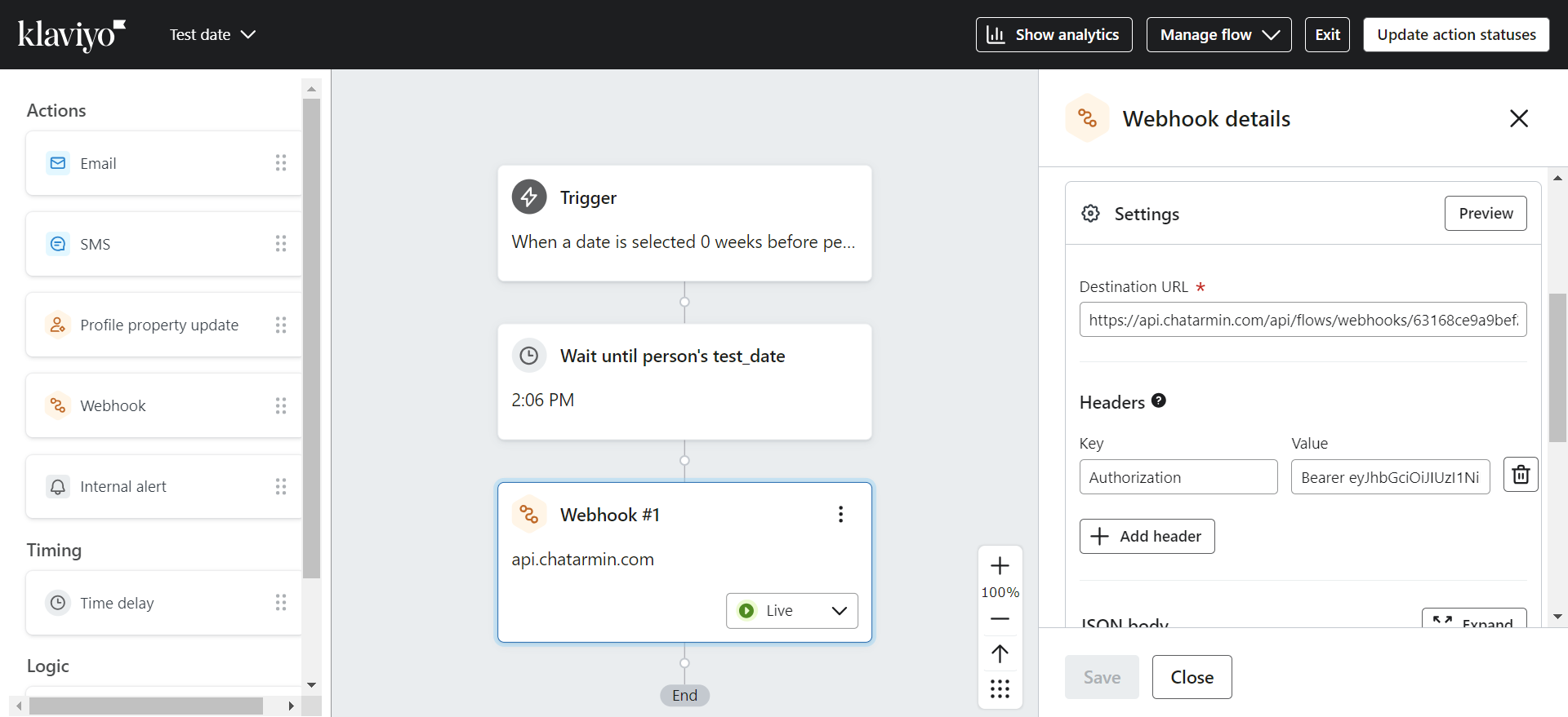 To create a "Chatarmin-Klaviyo Webhook" Flow insert a Webhook inside of a "Klaviyo Flow".