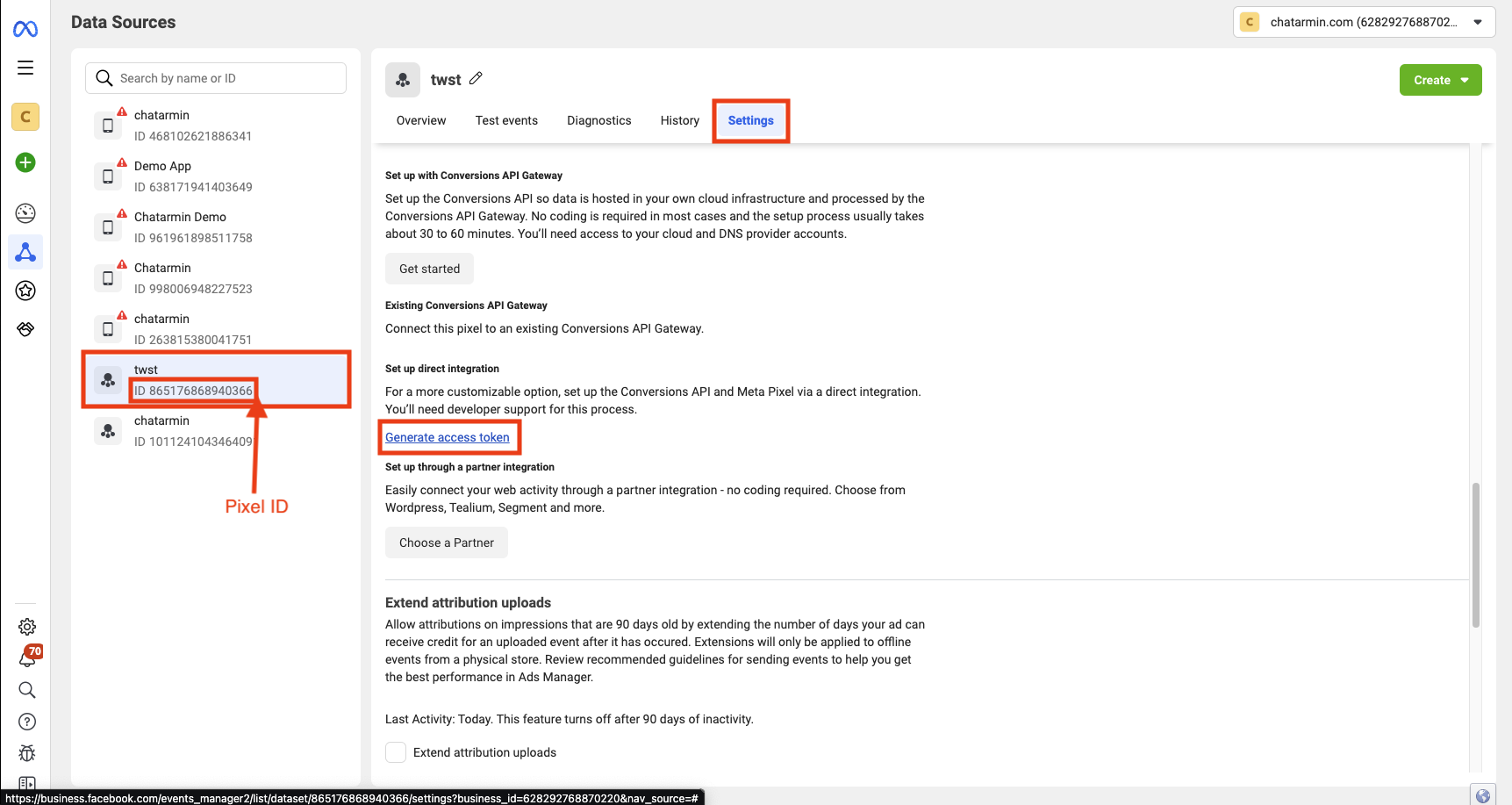 Then we can navigate to Settings -> Scroll down to "Generate Access Token" -> Copy Access Token & Pixel ID to Chatarmin