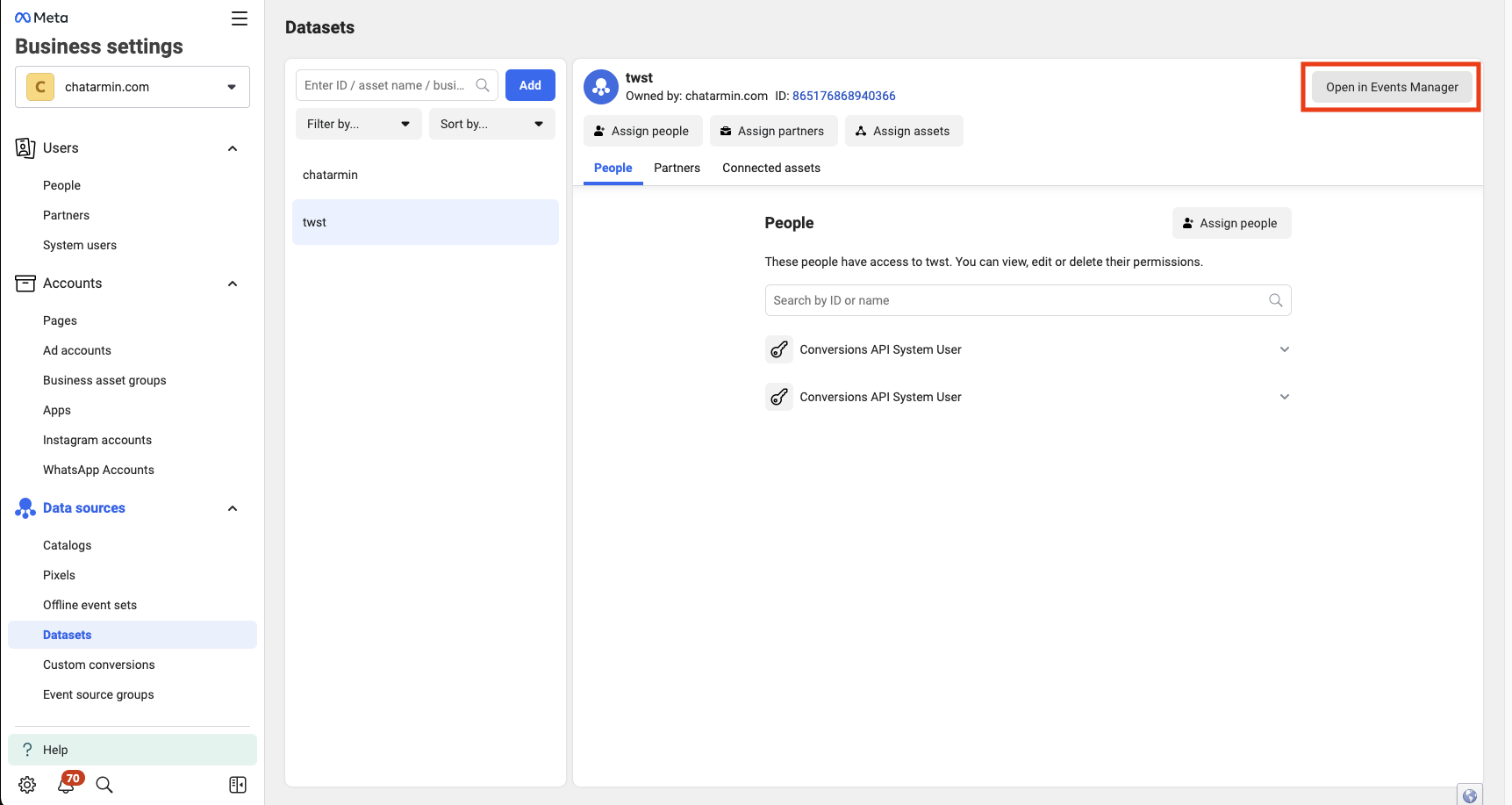 First, open your Business Manager and navigate to Date Sources -> Datesets -> Select your Pixel -> Click "Open in Events Manager"