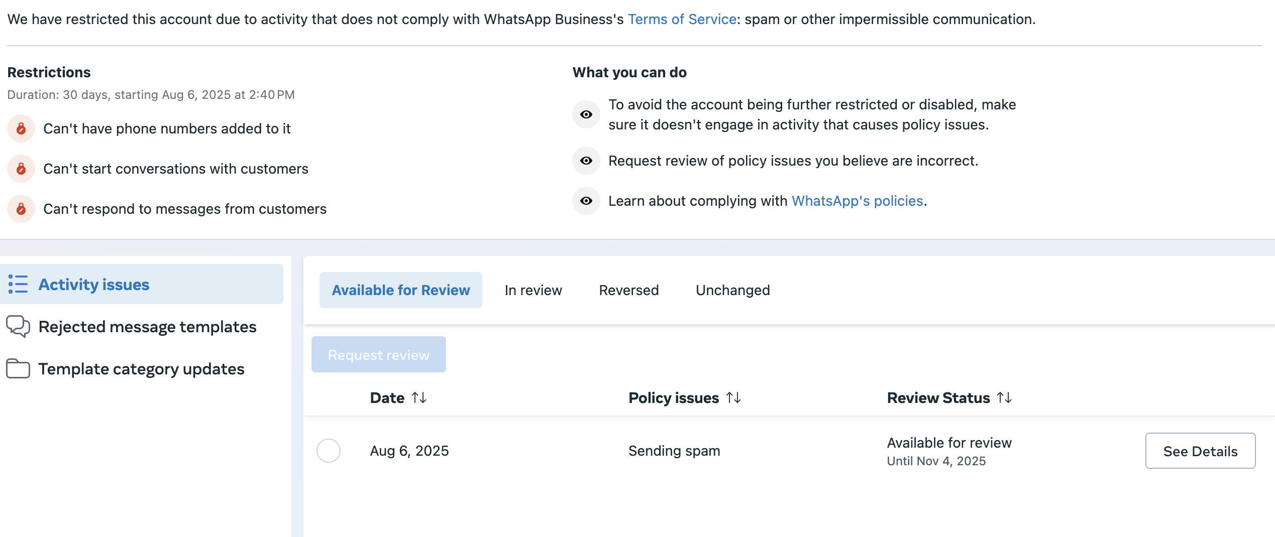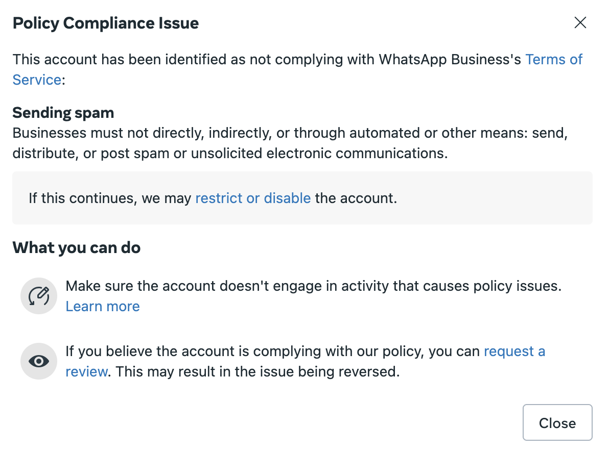 Your WhatsApp Business messaging capabilities have been restricted due to activity that does not comply with the WhatsApp Business Terms of Service.