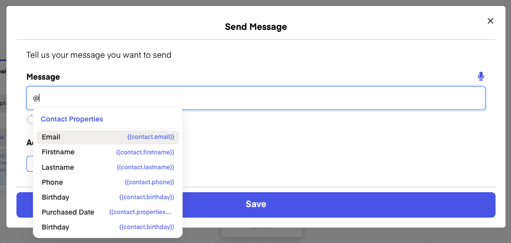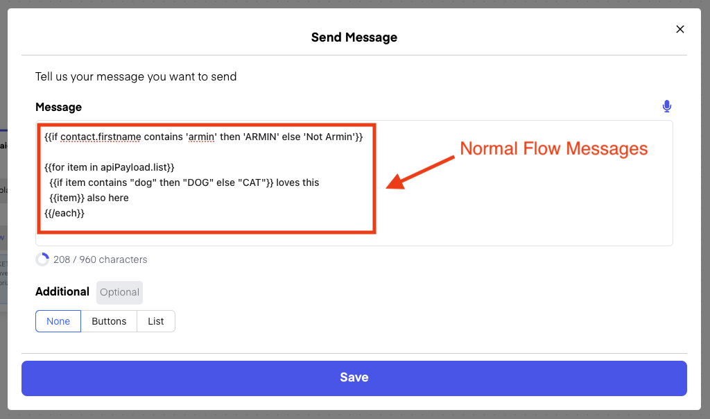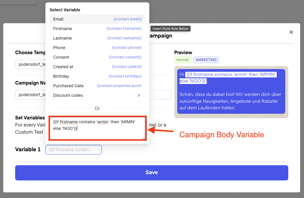 Example:#{{if contact.firstname contains 'dog' then 'Doglover' else 'Catlover'}}