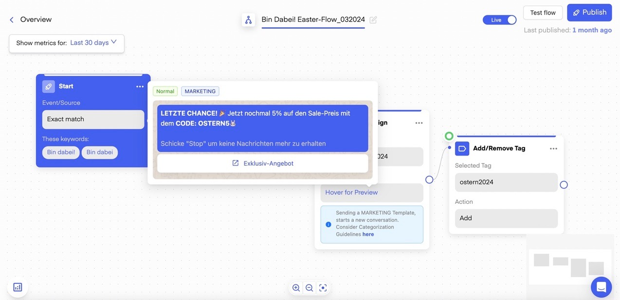 Tip! Test both your campaign as well as flow, before targeting your audience. When all is fine, start including a small segment of a fresh cohort of your existing clients, so you don't mess up your WABA abruptly.