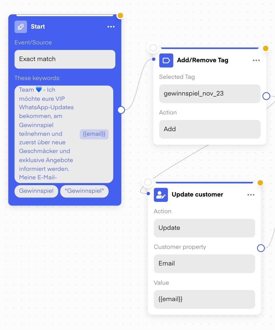 Everyone, who clicks on the chatstart-link in your email-campaign, will be funneled into a welcome-flow which is a buzzword-flow! Make sure to embed a "manage consent" and "double optin" action, so you keep track of your activated users!