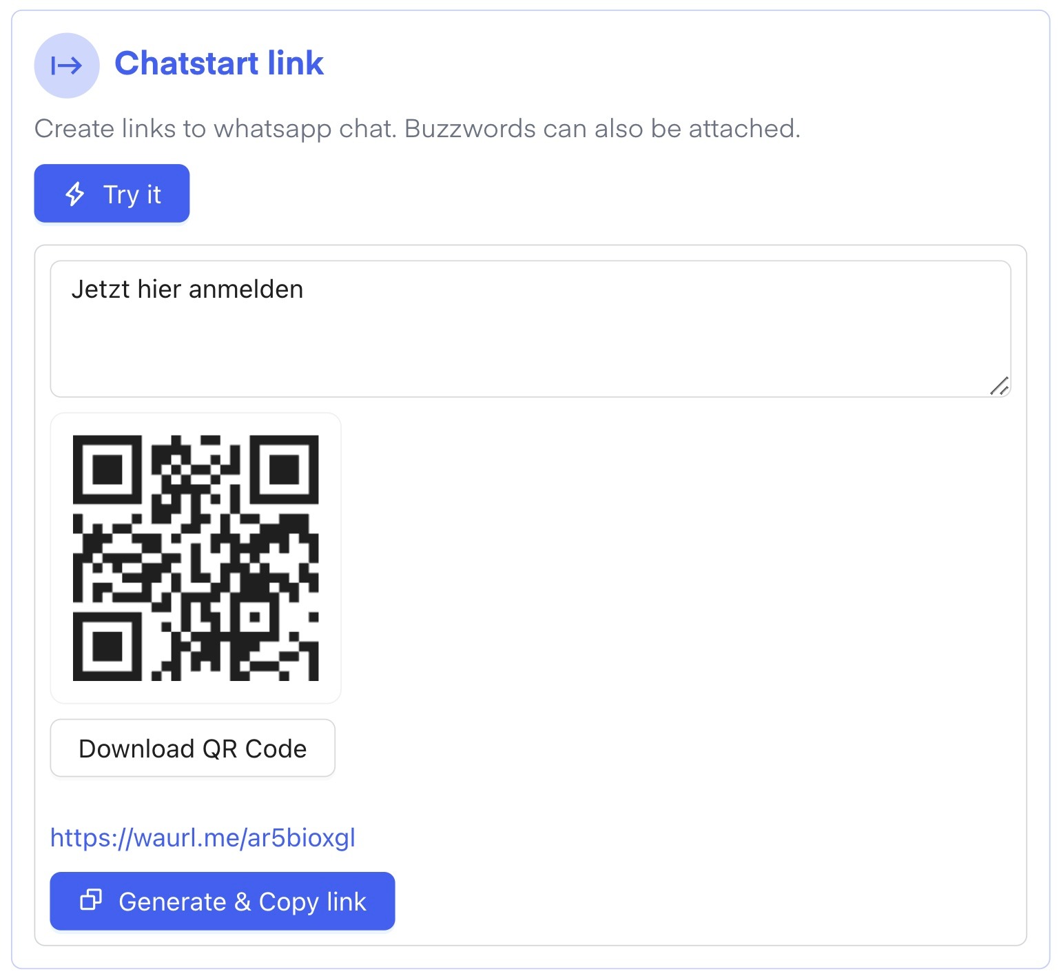 Create a Chatstart-Link with our WhatsApp-Chatstart-Link-Generator, or using the Chatstart-Link-feature in your Chatarmin Dashboard.