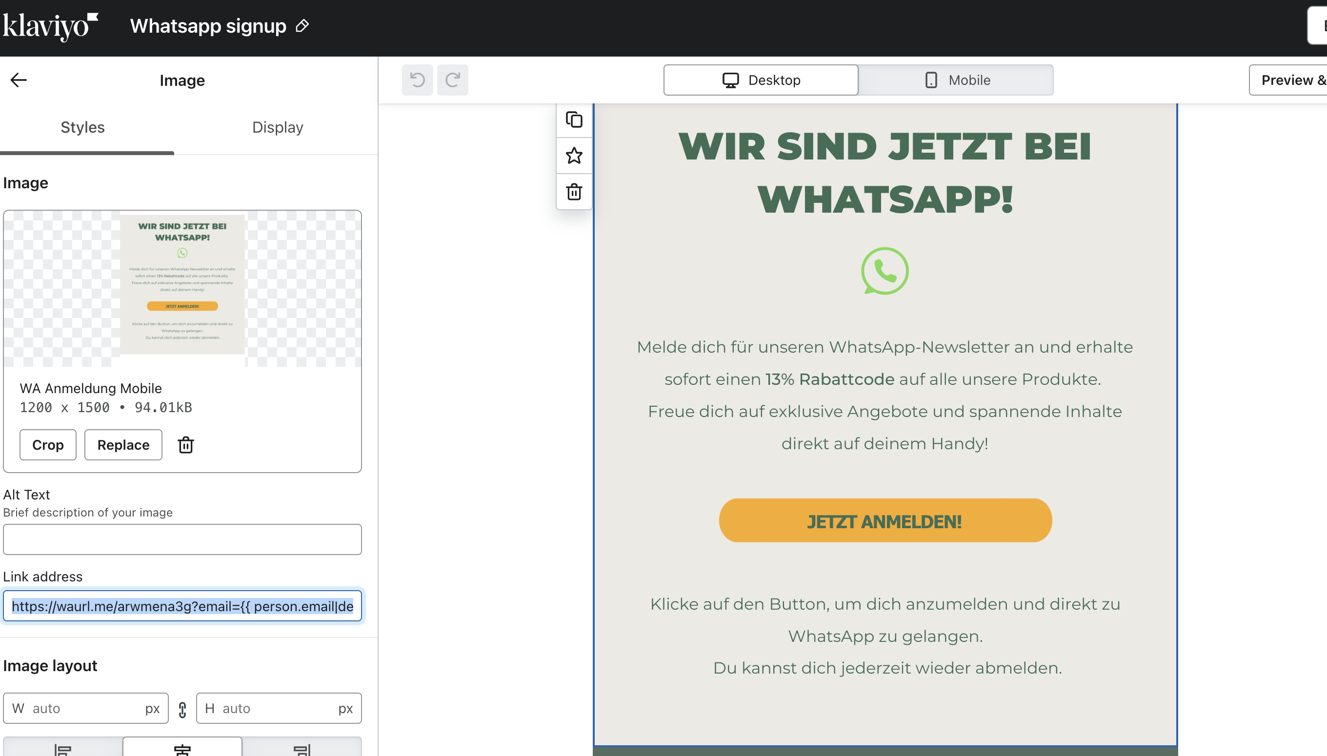 Follow all the action-steps above, but add a sauce of CRM-magic! Make sure you embed the klaviyo-email-adress of your users within the buzzword-flow, so they send it to your WABA with one click! The email address of your klaviyo-lead is automatically embedded in the chatstart-link, so you don't have to ask for the email adresses of your fresh optins! This is how you do it: