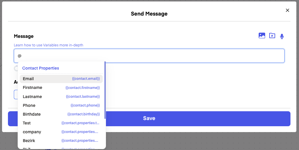 You can also use them in "Send message". Just type the key "@" in the Field and you will see all the available Variables: