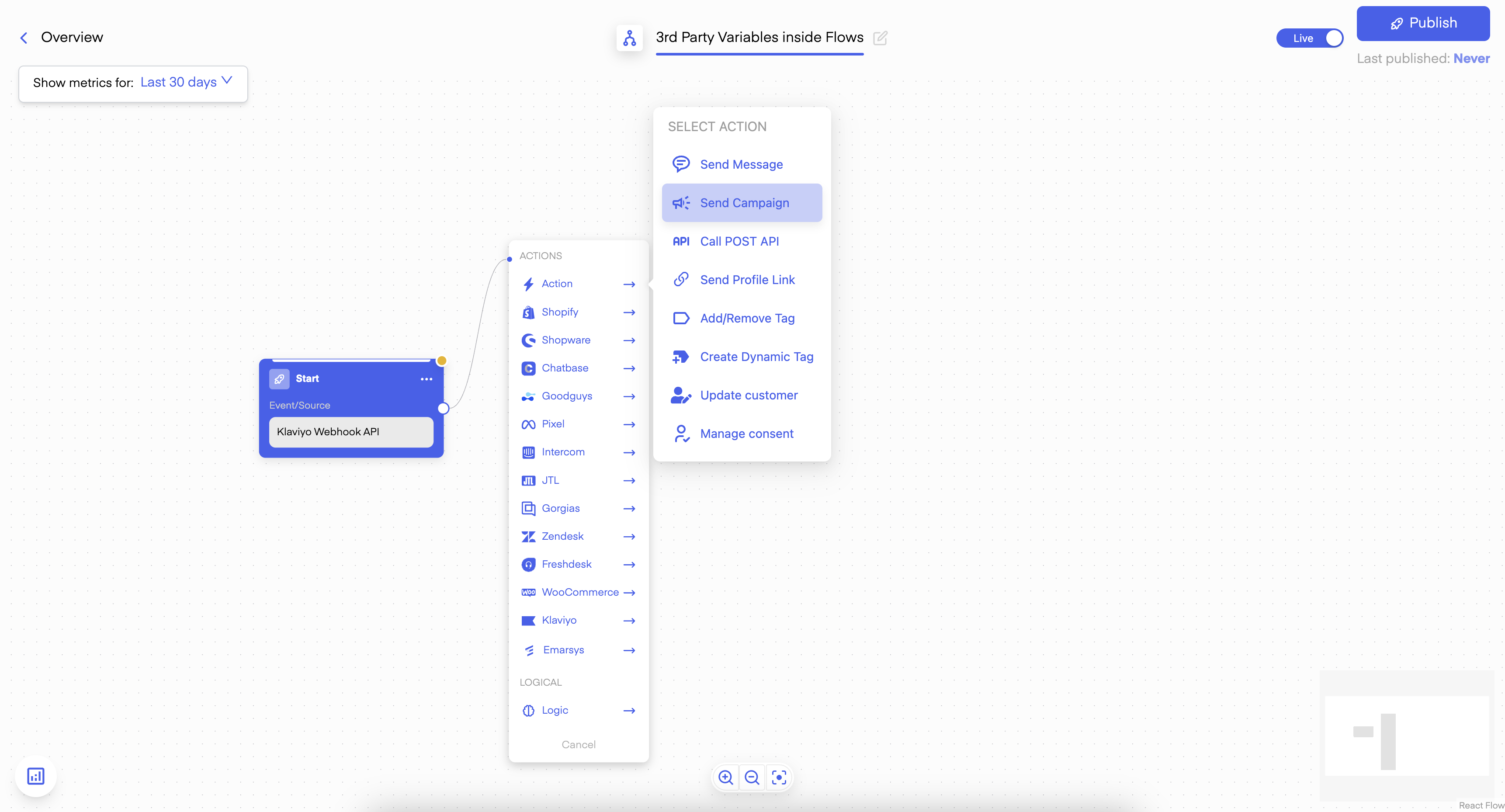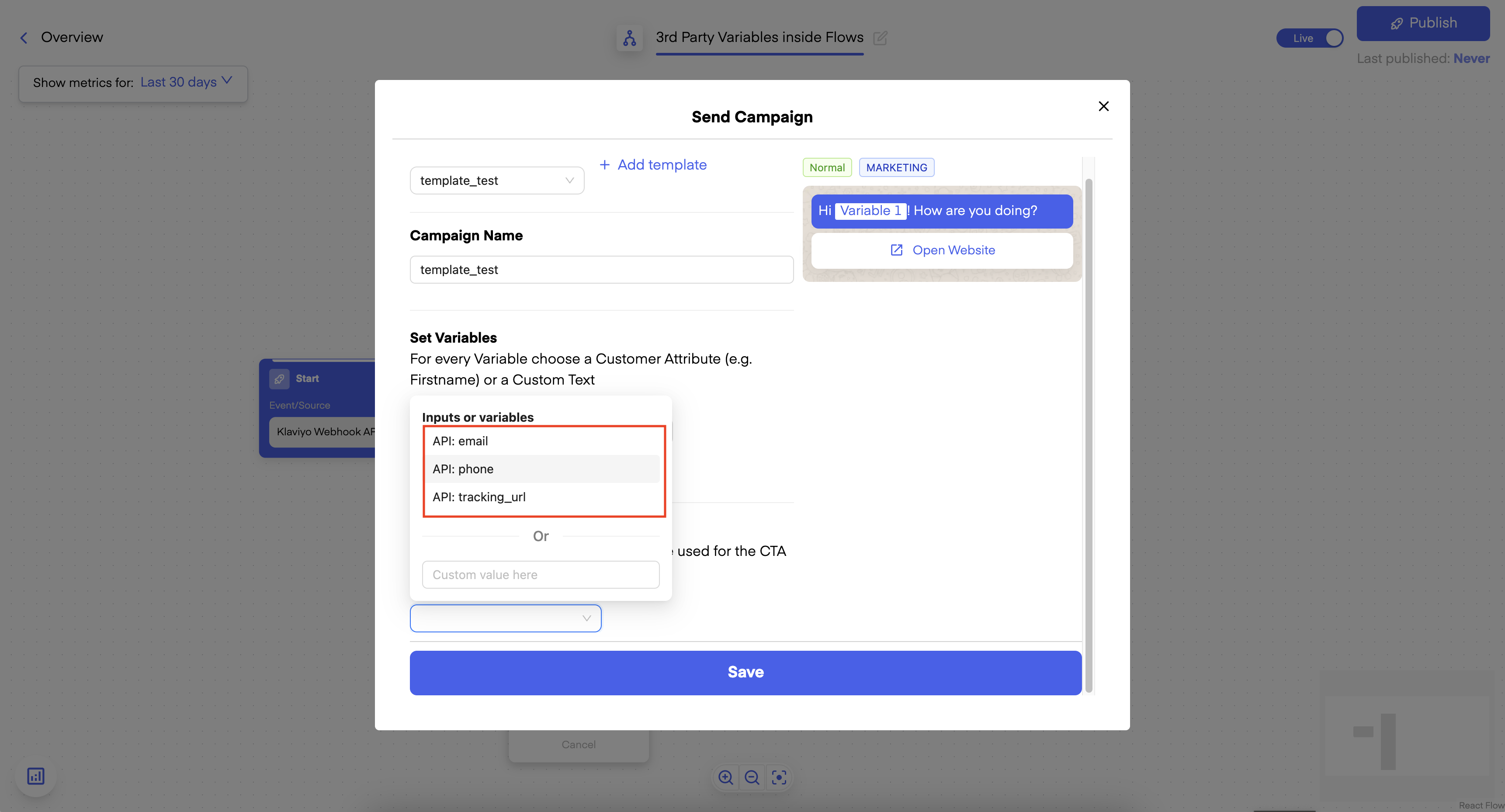 When you want to use Variables passed through a third-party, your Flow Trigger has to be of type POST-Endpoint or Klaviyo Webhook. You can create a new flow here