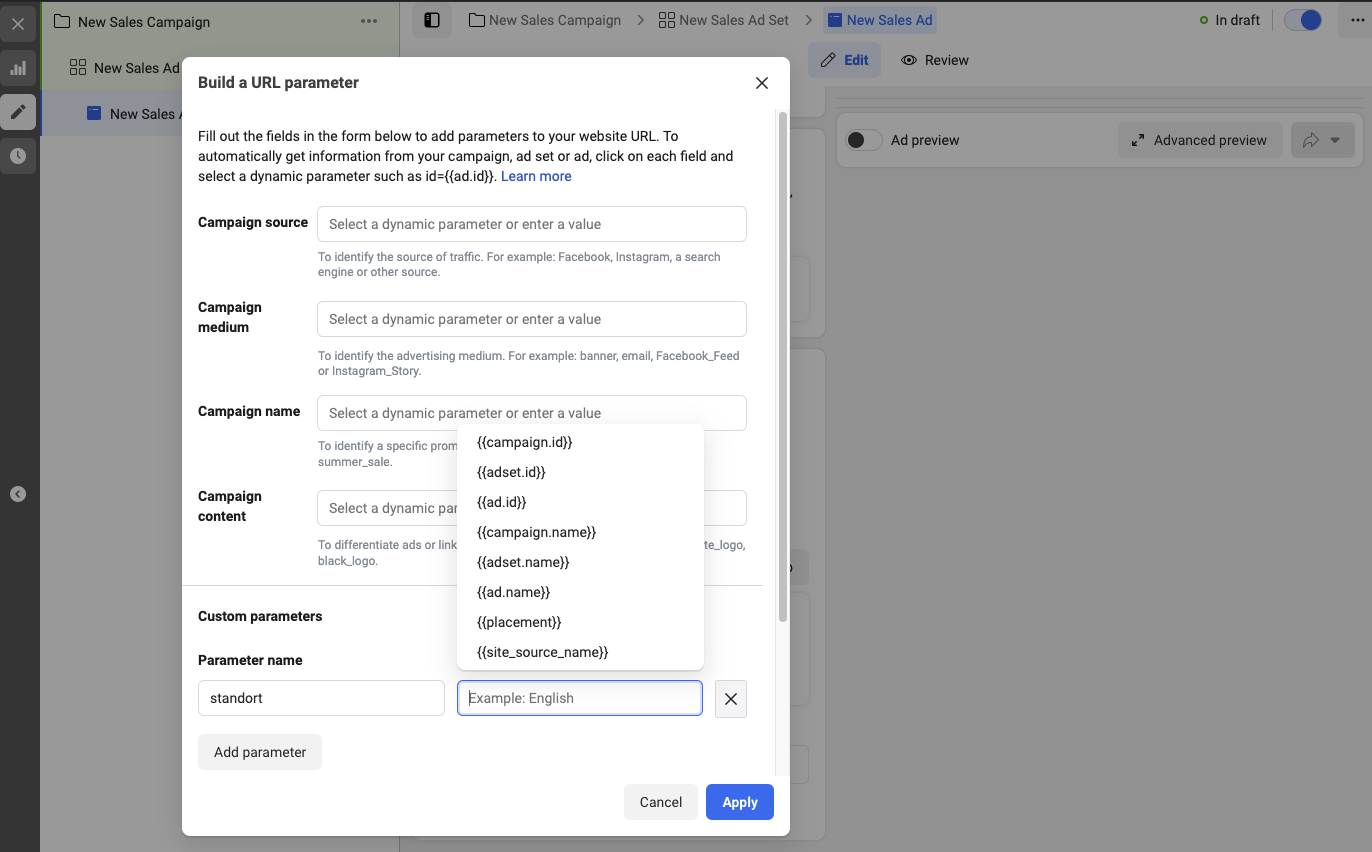 This "standort" ("location") parameter can be filled in the ad dynamically through their Variables.